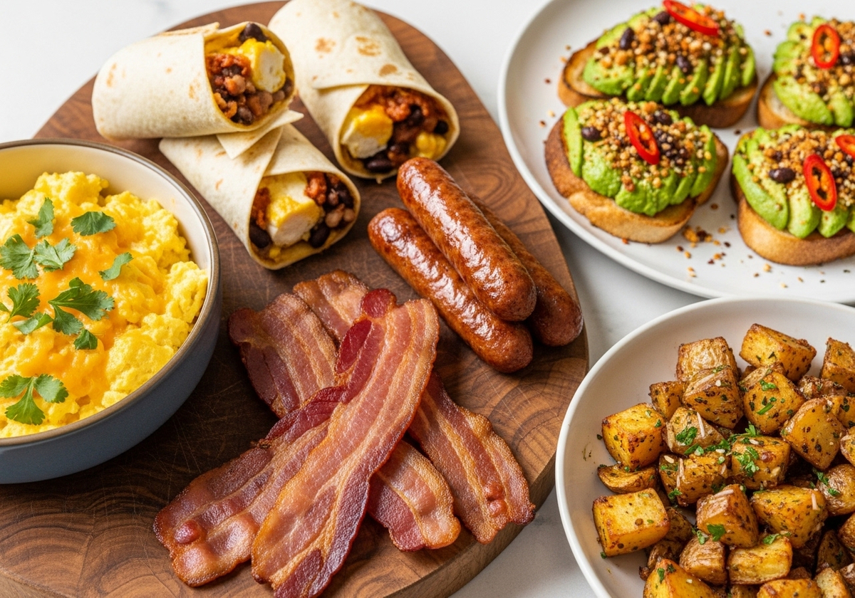 Meat Matters: Bacon, sausage, ham, or smoked salmon add a hearty touch. Consider offering vegetarian alternatives like veggie sausage or tofu scramble.